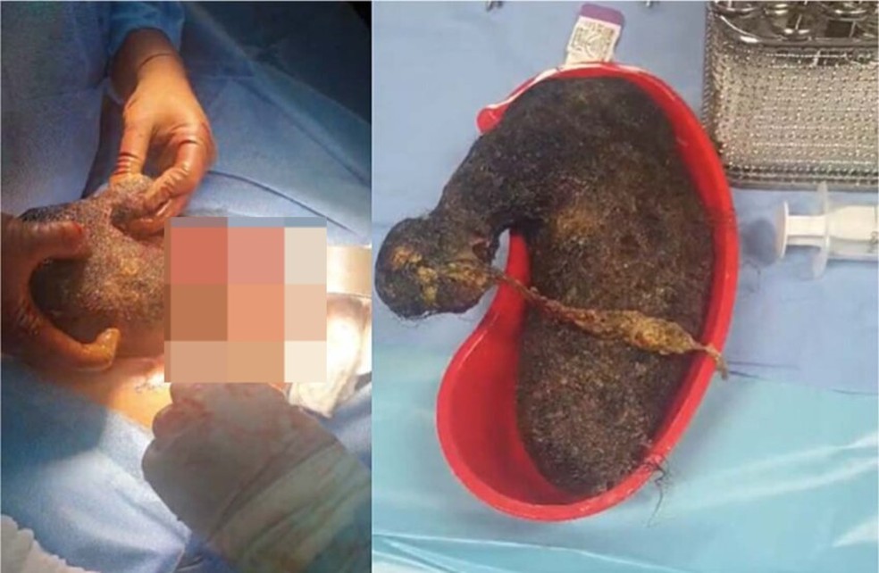 Os médicos notaram que o abdômen estava inchado e dolorido, com uma massa firme palpável. Exames de imagem confirmaram o diagnóstico: um enorme aglomerado de cabelos ocupava todo o estômago e se estendia até o duodeno, o que caracteriza a chamada "síndrome de Rapunzel".