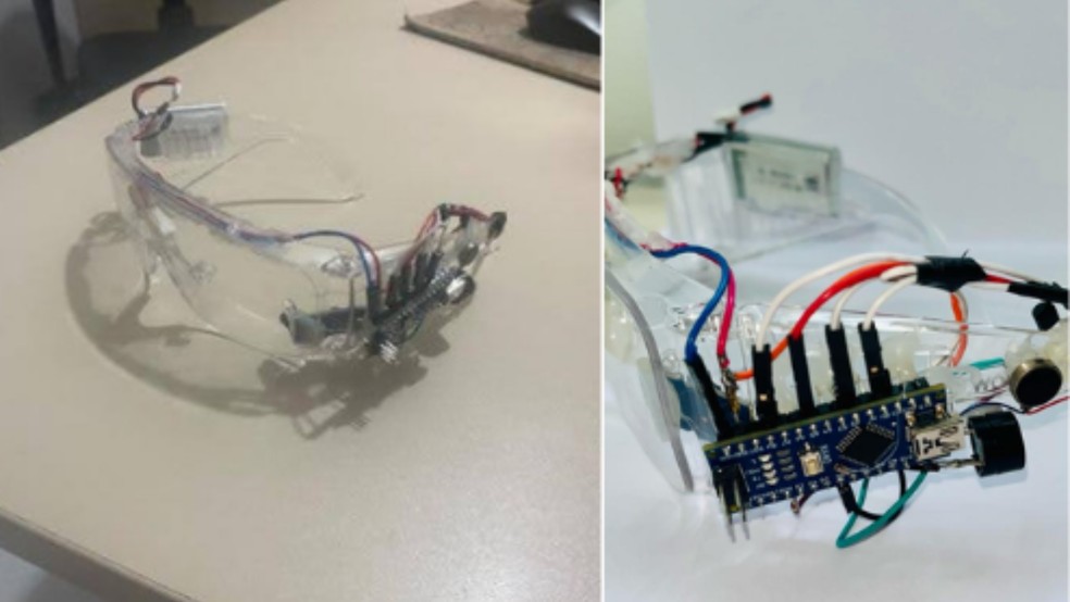 Projeto foi destaque em feiras de engenharia e continua sendo aprimorado pelos estudantes. Óculos usam tecnologia que emite o som próximo ao ouvido e faz uma pequena vibração no rosto do motorista.