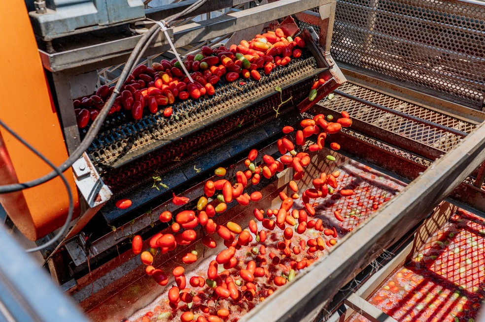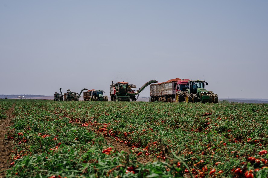 A colheita também é mecanizada, com colhedoras que separam os frutos das plantas e usam sensores de cor para identificar e rejeitar tomates fora do padrão, que ficam no solo, ajudando a enriquecer a terra com matéria orgânica e diminuindo a necessidade de fertilizantes para o próximo ciclo.