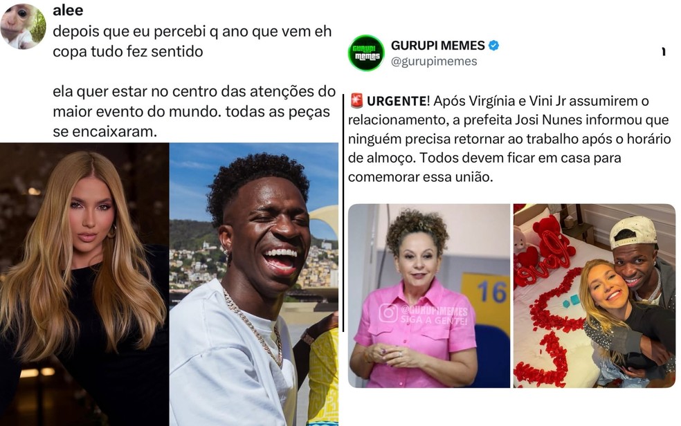 Virginia e Vini Jr: Veja memes criados por internautas após influenciadora e jogador assumirem namoro — Foto: Reprodução/X de Alee e Instagram de Gurupi Memes