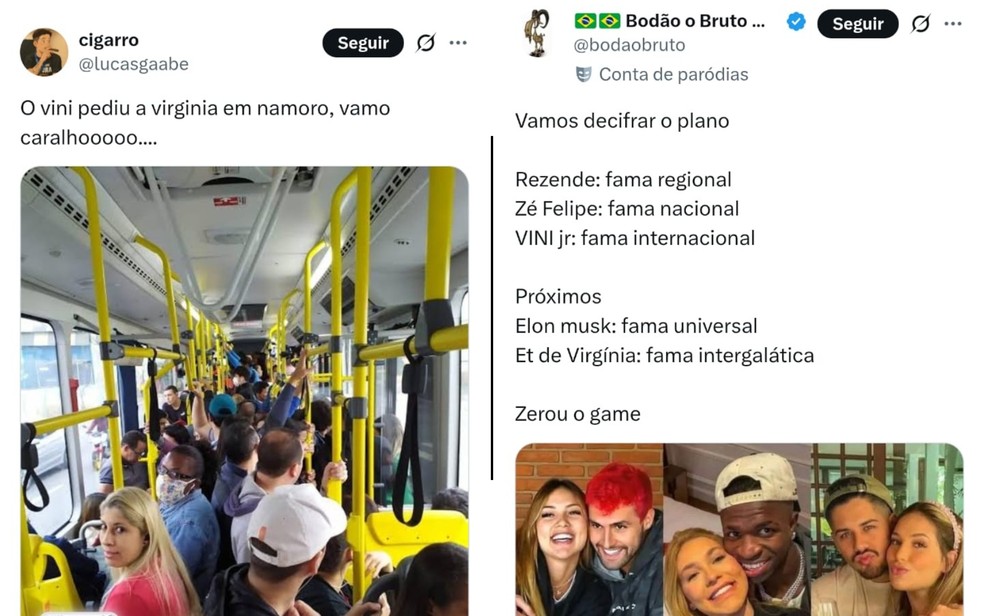 Virginia e Vini Jr: Veja memes criados por internautas após influenciadora e jogador assumirem namoro — Foto: Reprodução/X de Lucas Gaabe e Bodão o Bruto