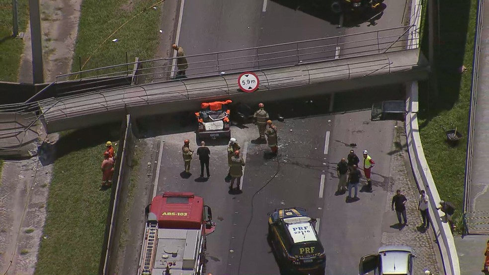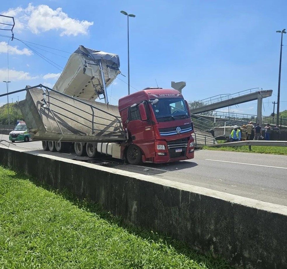 Segundo a Ecovias Rio Minas, concessionária responsável pelo trecho, um caminhão ergueu a caçamba e atingiu a passarela.