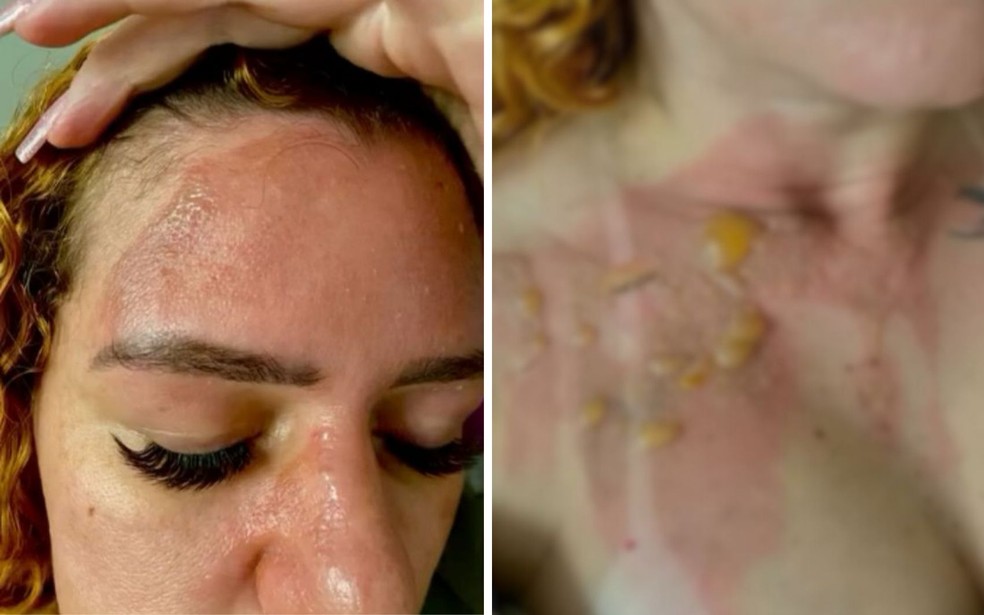Rapha Poppet, de 35 anos, relatou ter sofrido queimaduras de primeiro grau no rosto e de segundo grau no colo do peito. 'Foram 4 horas de muita dor e queimação', desabafou.