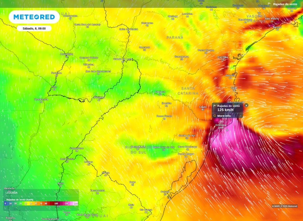 Rajadas de vento previstas para a manhã deste sábado (8).Ao longo do dia, o ciclone se afasta do continente, mas sua frente fria segue atuando sobre outras áreas do Brasil. Desta vez, as chuvas fortes atingem o Paraná, Mato Grosso do Sul e partes de São Paulo. Esses estados ficam em alerta, pois há chances de tempestades isoladas em vários municípios. O tempo permanece encoberto durante todo o dia.