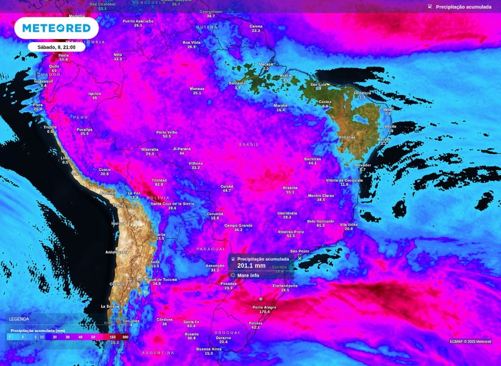 As chuvas intensas continuam atuando sobre o Rio Grande do Sul e leste de Santa Catarina na madrugada e manhã de sábado (8). A precipitação terá forte intensidade e, com o solo saturado, podem ocorrer diversos transtornos, além de rajadas de vento superiores a 100 km/h atingindo o litoral sul catarinense.