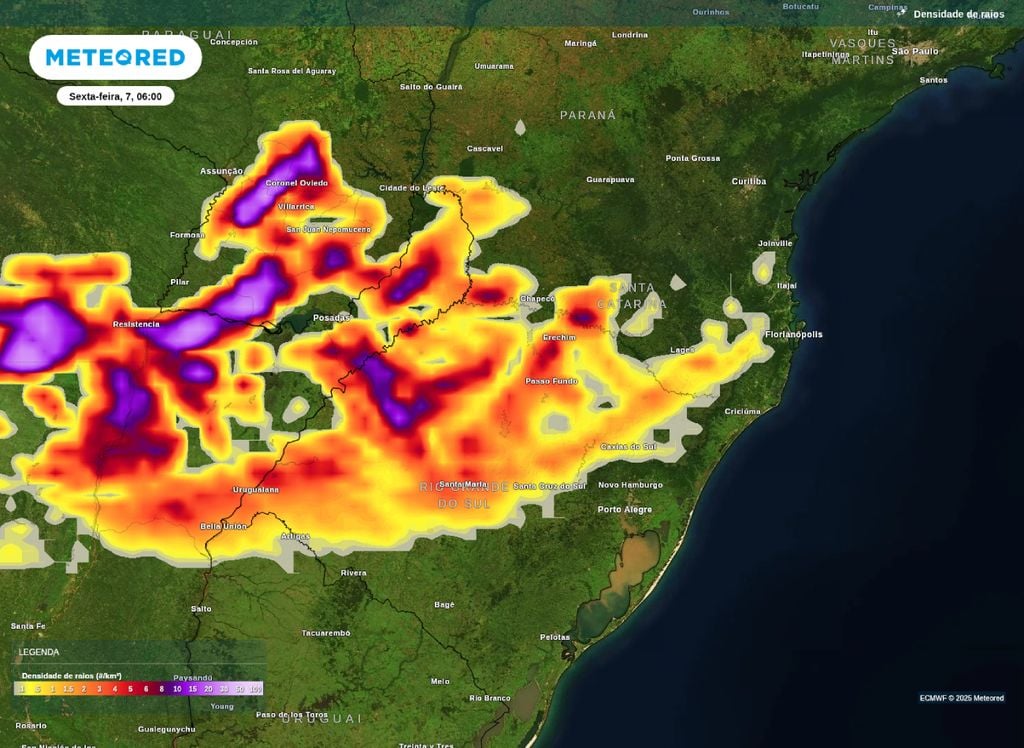 Densidade de raios indicam áreas propícias a tempestades na manhã desta sexta (7), de acordo com o modelo ECMWF.E a situação ainda pode piorar à medida que o ciclone ganha força ao longo da sexta-feira (7). Durante a tarde e noite, estão previstas rajadas de vento superiores a 95 km/h na região metropolitana de Porto Alegre/RS. As fortes rajadas não se concentram apenas no estado gaúcho.