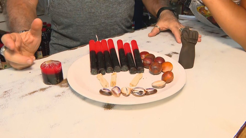 Hélio preparou um ritual para dar sorte para o Flamengo na final da Libertadores — Foto: Reprodução/ TV Globo |