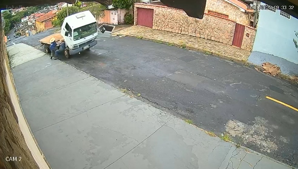 Imagens de uma câmera de segurança mostram o momento em que o caminhão, que estava estacionado, começa a descer uma ladeira em marcha à ré. Dois homens tentam segurá-lo, mas não conseguem.
