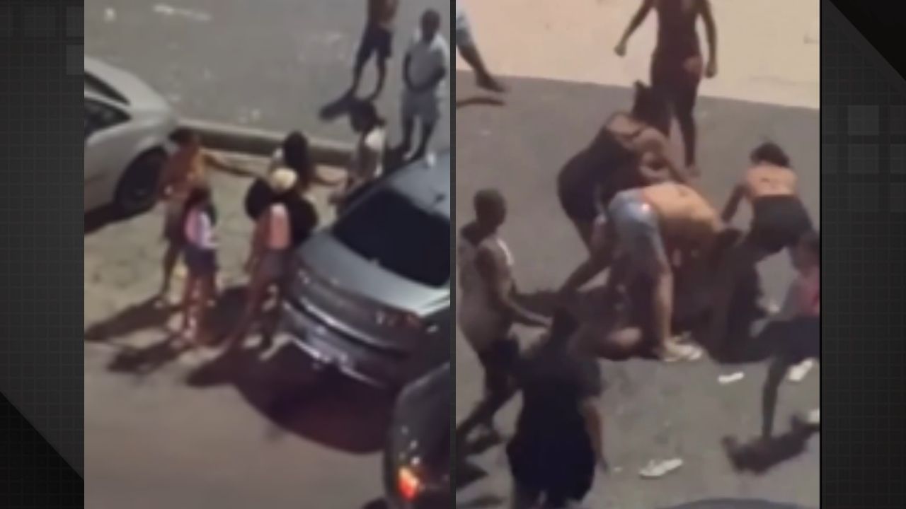 Imagens que circulam nas redes sociais mostram várias mulheres trocando agressões físicas enquanto homens e crianças tentam separar a confusão. A discussão teria começado por conta da disputa por uma vaga para estacionar o carro.