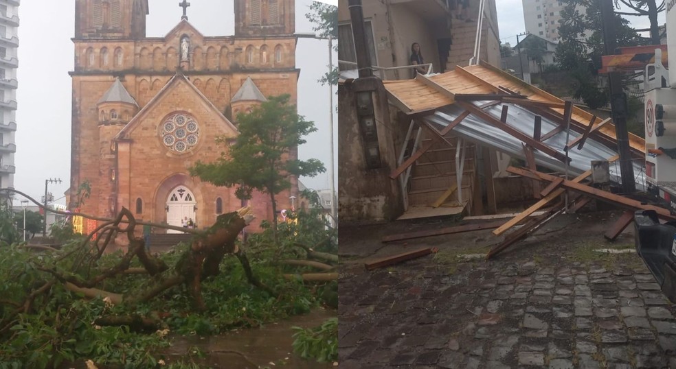 No Centro, na Praça da Catedral, a copa de uma árvore foi arrancada pelo vento. A área foi isolada e a limpeza ocorre nesta terça-feira (23).
