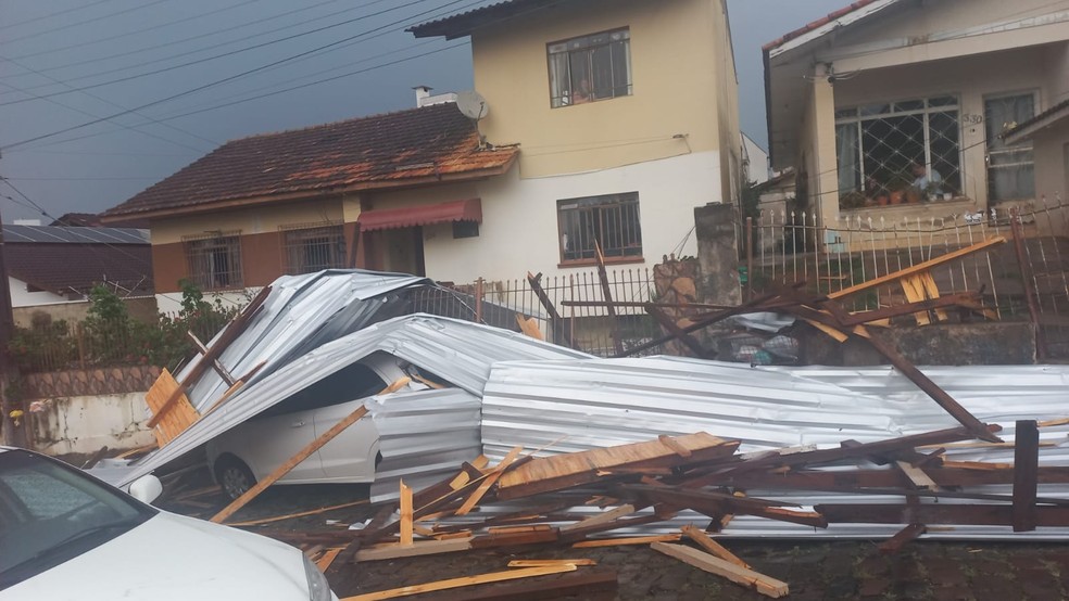 Um vídeo publicado nas redes sociais mostra o momento em que o telhado de uma casa é arrancado pela força do vento. No registro, também é possível ver faíscas após o vendaval (assista abaixo).