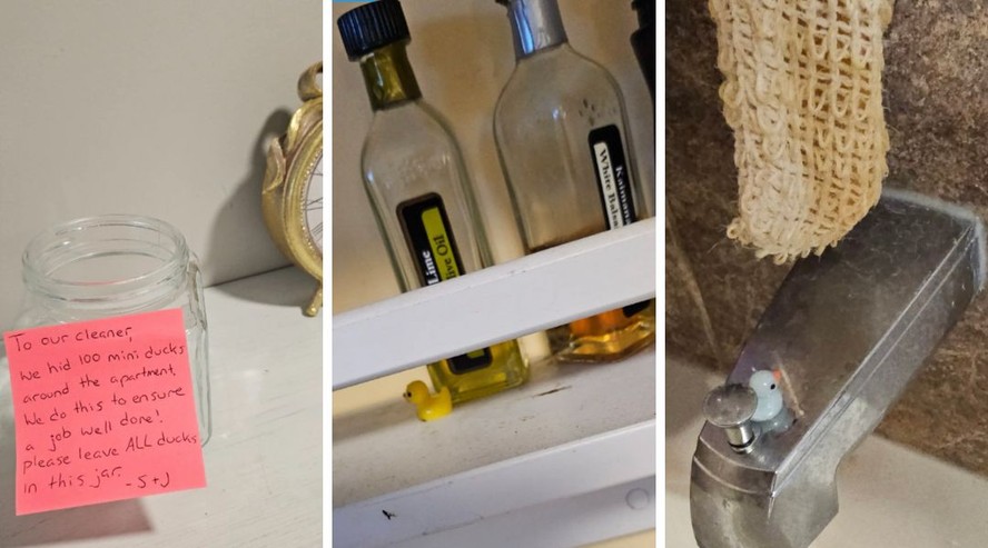 Em uma série de fotos divulgadas no X pela usuária @PatsKam, em 22 de janeiro, é possível ver alguns dos pequenos patos de plástico escondidos em uma prateleira, atrás de uma torneira e de um sofá, além de uma mensagem escrita em um post-it. “Para a pessoa da limpeza, nós escondemos 100 patinhos ao redor do apartamento. Fazemos isso para garantir um trabalho bem feito! Por favor, coloque TODOS os patos nesta jarra”, diz o bilhete.