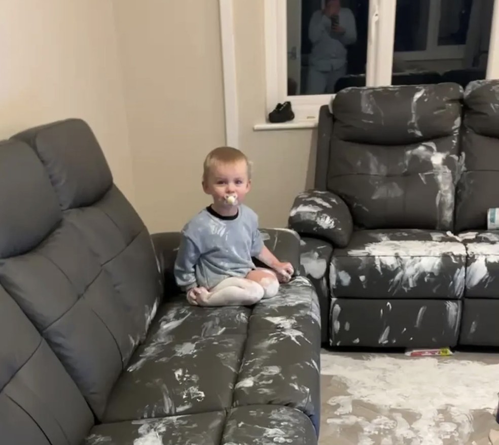 Na Inglaterra, uma mãe encontrou a sala recém-decorada e os sofás novos cobertos de tinta após deixar o filho de dois anos assistindo à TV enquanto colocava o bebê para dormir