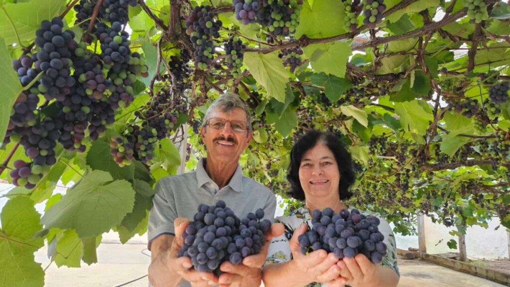Cezar e Maria da Penha recebem os visitantes todos os dias durante o período da colheitaO feito inédito é fruto da dedicação do casal Cezar Huber e Maria da Penha, que cultiva as videiras da variedade Isabel há cerca de 18 anos. “Já tivemos colheitas acima de 450 quilos, mas neste ano a produção vai ser recorde. Deve ultrapassar os 500 quilos”, afirma Cezar, orgulhoso do resultado.
