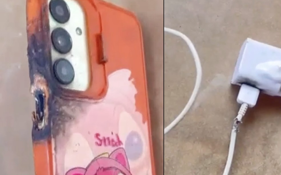 | Celular e carregador que Beatriz usava quando sofreu o acidente — Foto: Reprodução/Redes Sociais |