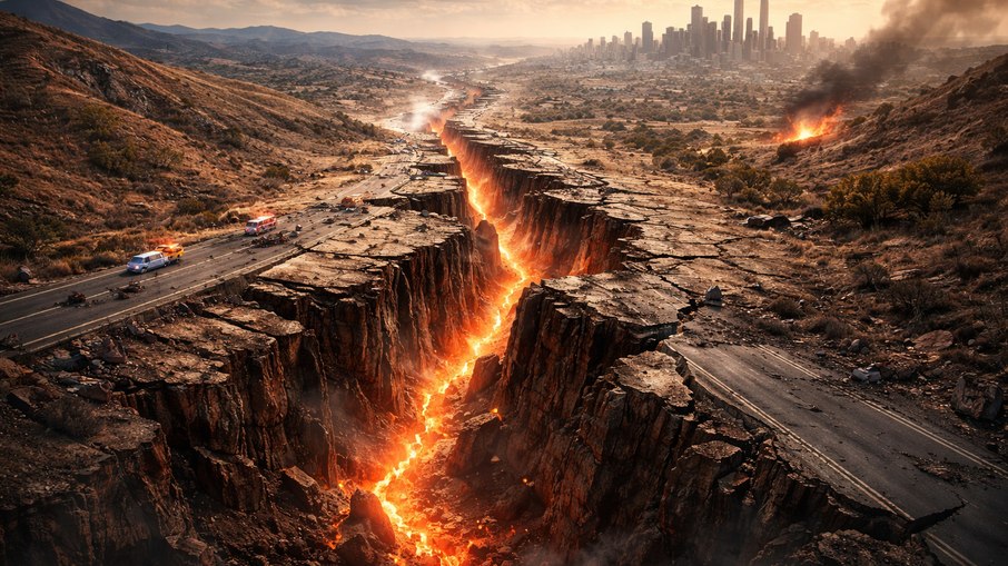 Imagem gerada por IA - A rachadura que pode partir a Califórnia ao meio já está se movendo |