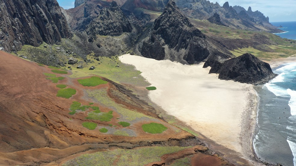 Praia das tartarugas na Ilha da Trindade é cercada por vegetação e rochas. — Foto: Reprodução/Yara de Mello