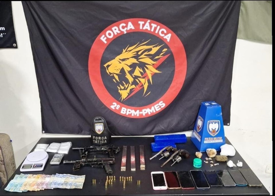 Na tarde da segunda-feira (26), equipes da Força Tática do 2º Batalhão realizaram uma operação no distrito de Cedrolândia, na zona rural de Nova Venécia que resultou em uma expressiva apreensão de drogas, quatro armas de fogo, entre elas, duas submetralhadoras, 23 munições intactas, grande quantia em dinheiro e aparelhos celulares.