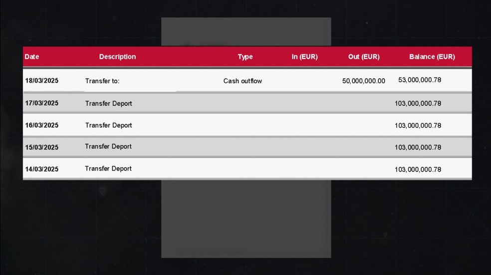 Extrato de quantia eu euros apresentada por empresário a cliente do Tresory Bank — Foto: Reprodução/EPTV |