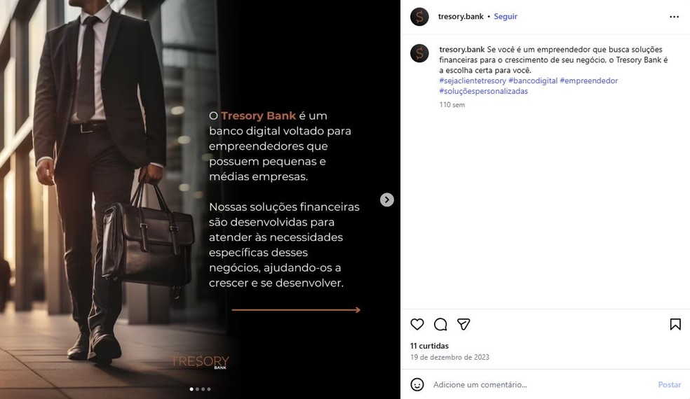 No perfil ativo no Instagram, o Tresory Bank se define como um banco digital voltado a empreendedores que possuem pequenas e médias empresas. As soluções financeiras são para atender necessidades específicas desses negócios para seu crescimento e desenvolvimento.