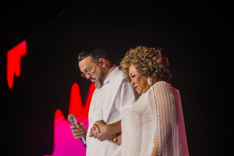 Belo recebe a cantora Alcione no Palco Rio — Foto: Rafael Catarcione / Riotur
