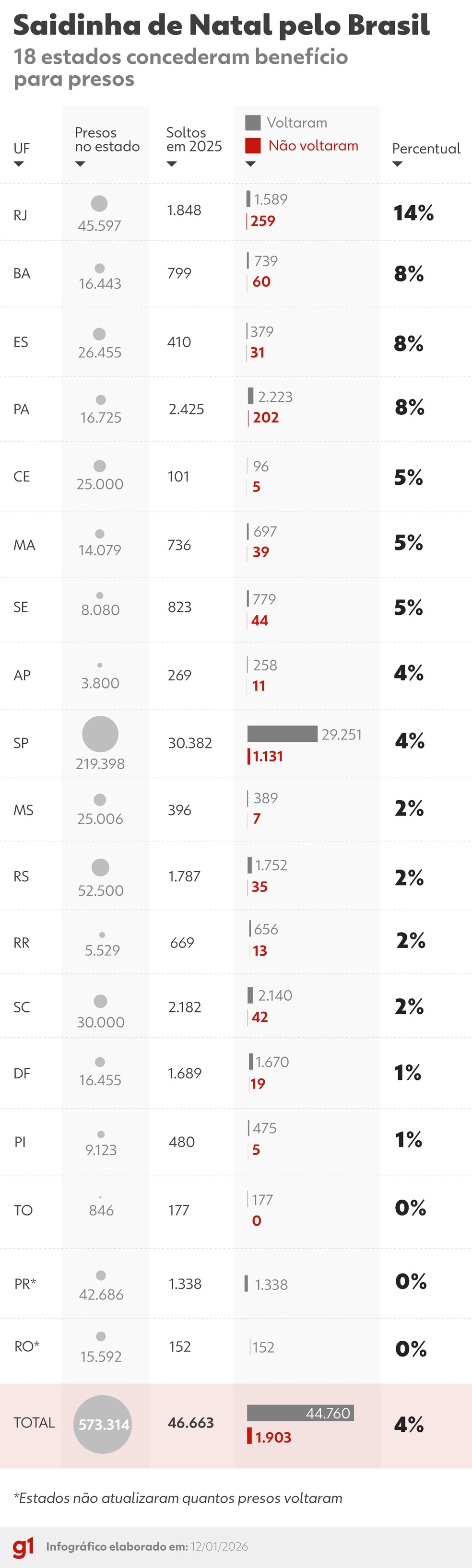 - Dois estados (Paraná e Rondônia) não informaram o número de presos que voltaram às cadeias até o fechamento da reportagem.