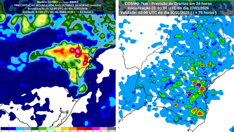 | Tons em vermelho e roxo indicam áreas com maior acumulado de chuva e maior probabilidade de ocorrência de granizo, respectivamente — Foto: Inmet |