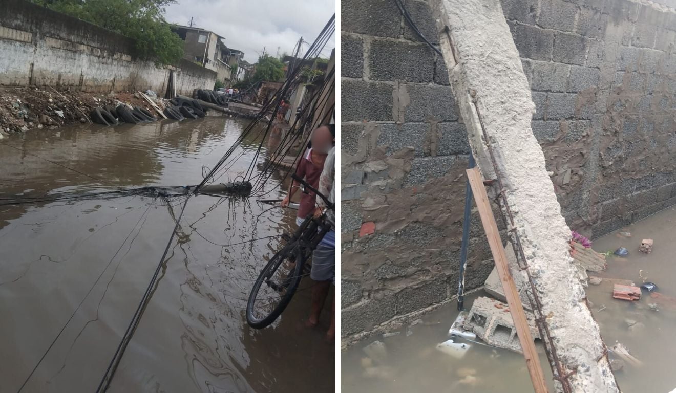 Um grande alagamento também tomou conta da rua, o que dificulta com que moradores possam se locomover pelo local.