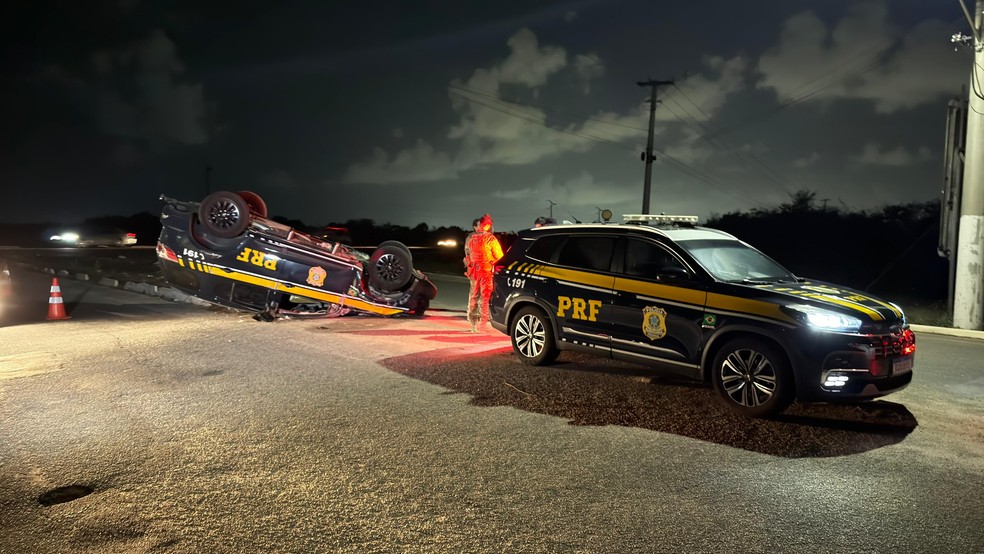 Uma viatura da Polícia Rodoviária Federal (PRF) capotou na noite desta quarta-feira (21), durante uma perseguição a um motociclista na BR-101, no município de Extremoz, na Grande Natal.
