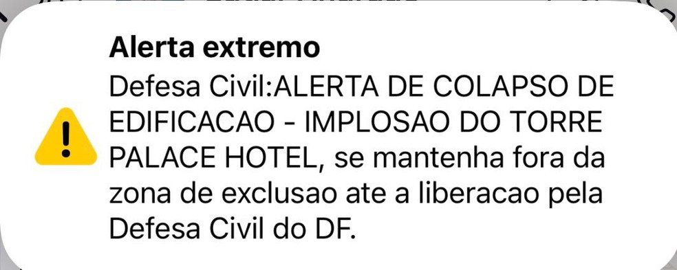"Defesa Civil: ALERTA DE COLAPSO DE EDIFICAÇÃO - IMPLOSÃO DO TORRE PALACE HOTEL, se mantenha fora da zona de exclusão até a liberação pela Defesa Civil do DF", dizia o aviso.