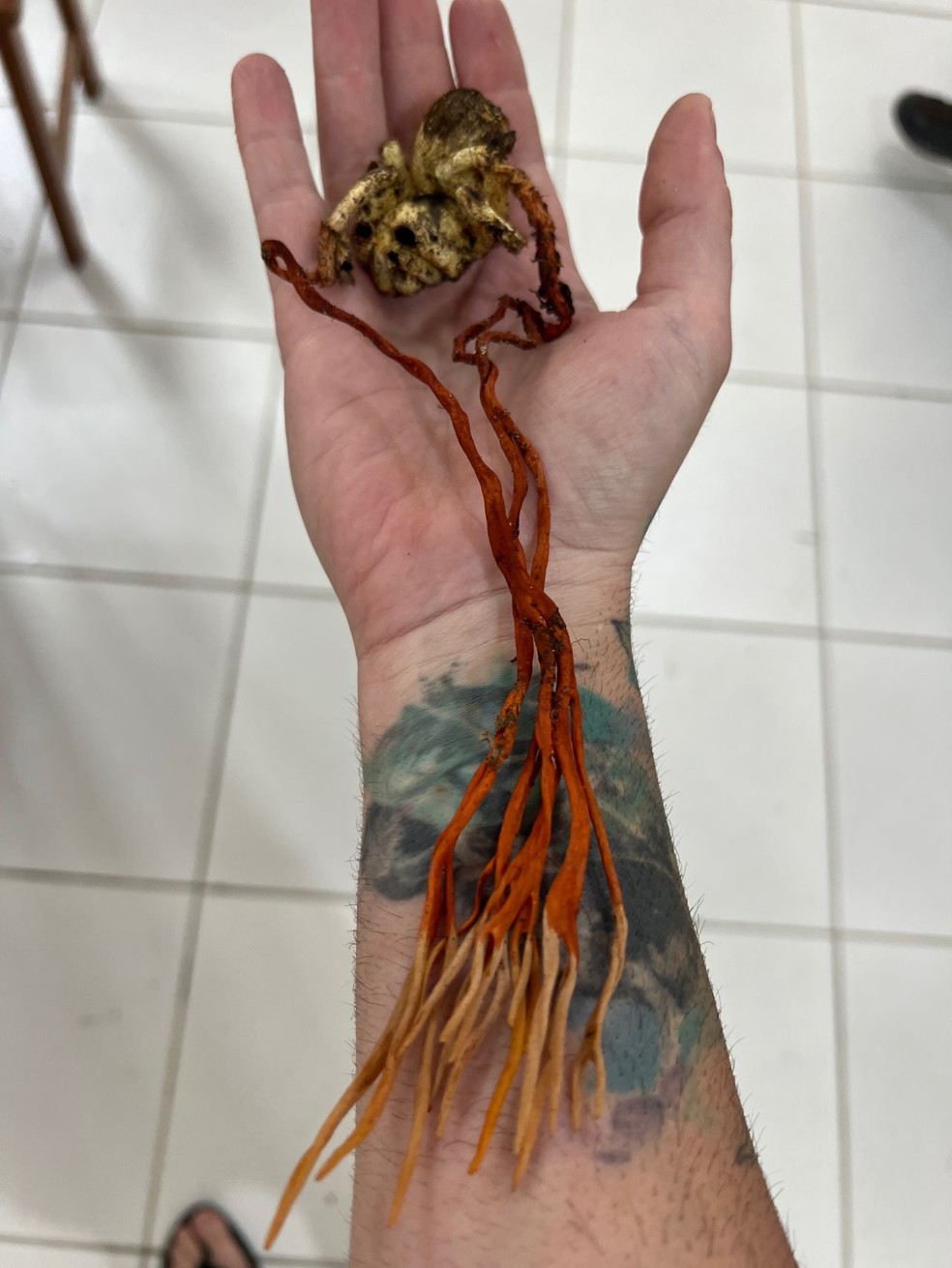 | Depois de consumir todos os tecidos internos da tarântula, o fungo emergiu de seu corpo, preparando-se para se reproduzir — Foto: LinkedIn (João Paulo Machado de Araújo) |
