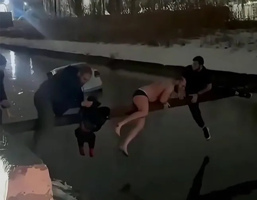 | Imagens que circulam nas redes sociais mostram momento em que menino é resgatado de canal congelante no Daguestão — Foto: Reprodução | X |
