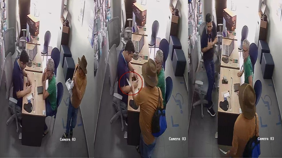 As imagens mostram Manuel Ferreira chegando ao local usando uma camisa alaranjada e um chapéu marrom. Ele joga uma pilha de papéis em cima da mesa onde Carlos André atendia outro cliente.
