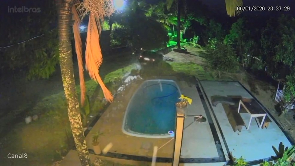 Em um vídeo gravado por câmeras de segurança, é possível ver o carro invadindo a residência. O carro parou próximo a uma árvore dentro do terreno, ao lado de uma piscina.