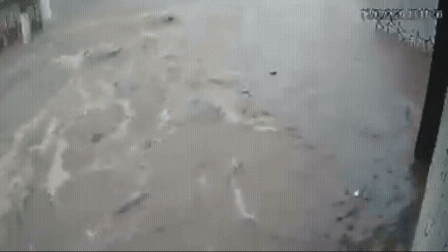No vídeo, às 17h02, o asfalto está apenas molhado e pedestres ainda transitam pela calçada. Apenas dois minutos depois, às 17h04, a água barrenta já cobre o meio-fio e começa a lamber a entrada das lojas. O desespero aumenta visivelmente entre 17h06 e 17h08, quando a enxurrada ganha força e volume, invadindo os estabelecimentos.