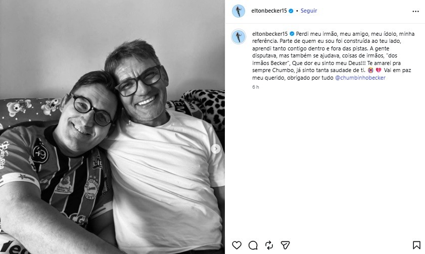"Perdi meu irmão, meu amigo, meu ídolo, minha referência. Parte de quem eu sou foi construída ao teu lado, aprendi tanto contigo dentro e fora das pistas. A gente disputava, mas também se ajudava, coisas de irmãos, “dos irmãos Becker”, Que dor eu sinto meu Deus!!! Te amarei pra sempre Chumbo, já sinto tanta saudade de ti. Vai em paz meu querido, obrigado por tudo @chumbinhobecker".