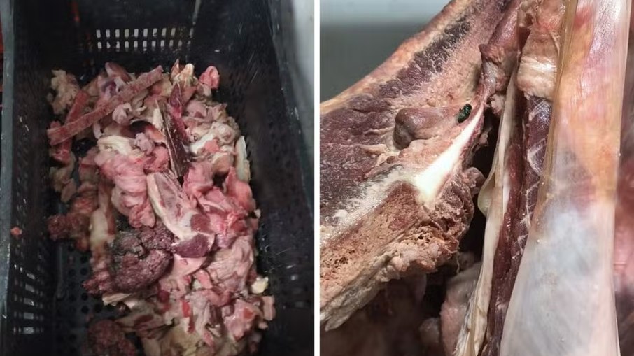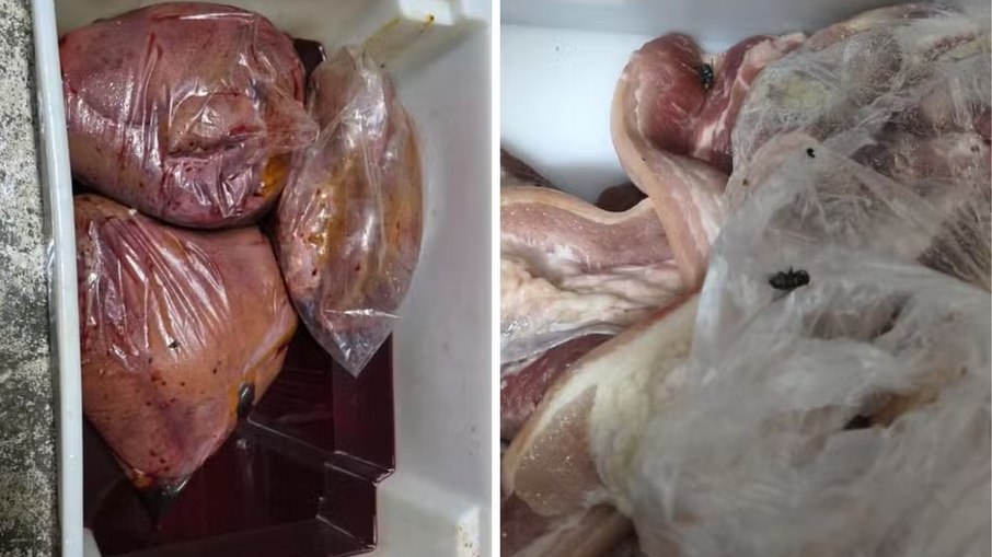 Imagens feitas no local mostram carnes, queijos, pizzas pré-prontas, embutidos e especiarias armazenados de forma inadequada, além da presença de insetos.
