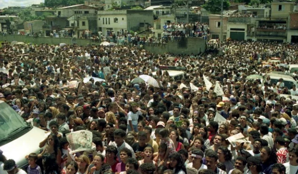Velório dos músicos do Mamonas Assassinas, em Guarulhos — Foto: José Luís da Conceição/Agência O GLOBOEspaço aberto aos fãs