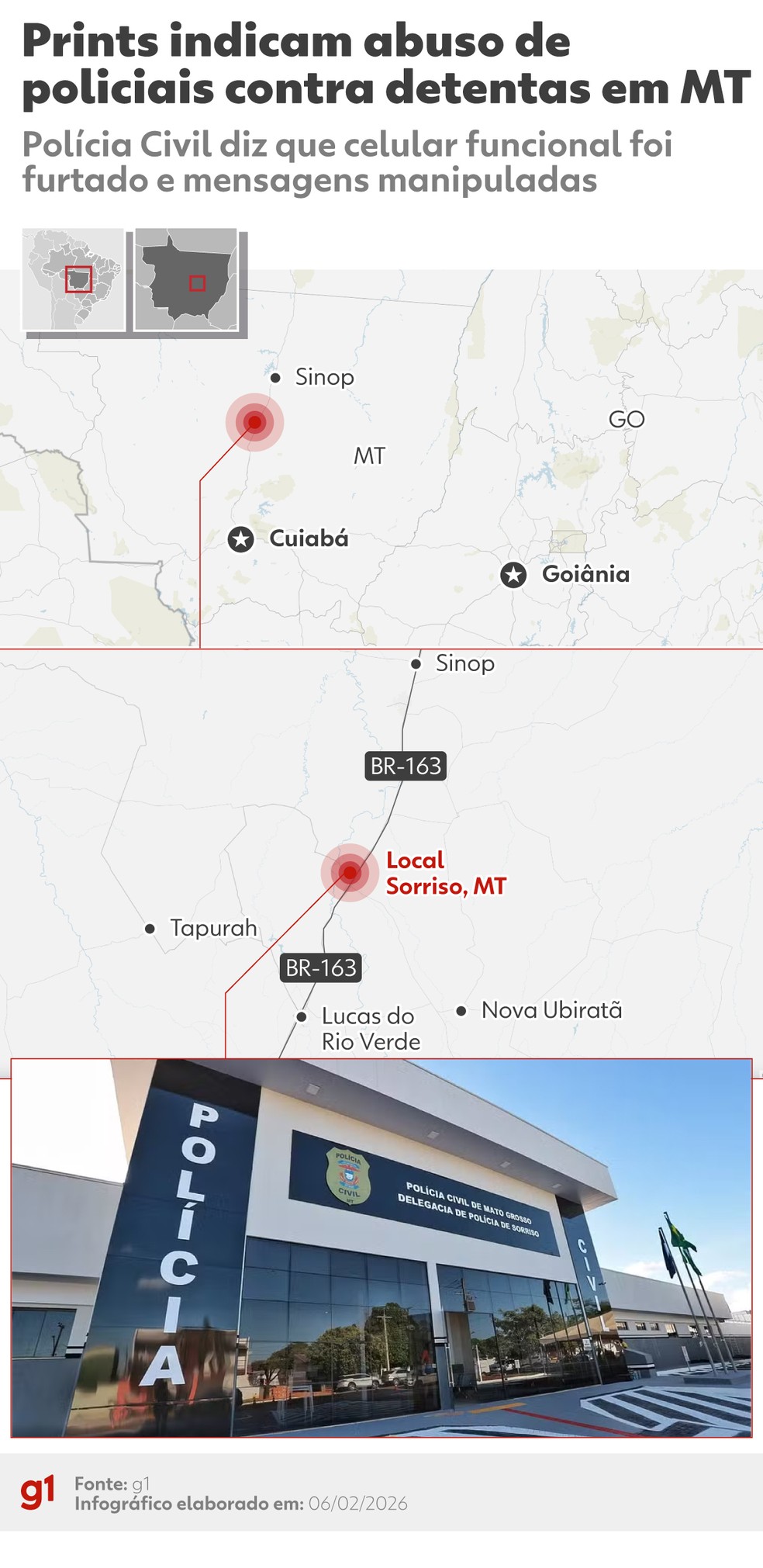 Mensagens vazadas de um celular funcional da Delegacia da Polícia Civil de Sorriso (MT), em dezembro, mostram comentários, em um grupo de WhatsApp, que sugerem abusos sexuais a outras detentas e possíveis torturas a investigados. A Polícia Civil diz que o aparelho de onde partiram os vazamentos foi furtado meses antes, em outubro do ano passado.