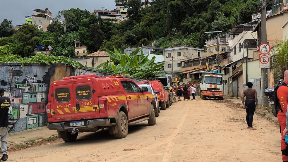 Bombeiros procuram por desaparecidos em Ubá neste sábado (28) — Foto: Marcus Pena/TV Integração |