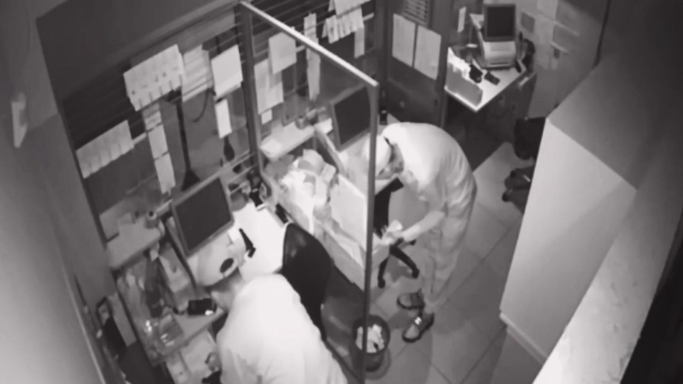 Conforme mostram as imagens de câmeras de segurança, o grupo chega de carro e para no meio da rua. Em seguida, a porta da lotérica é arrombada, e o caixa revirado. Com a ajuda de outro homem que aguardava na rua, os suspeitos pegam um cofre grande e o colocam no automóvel.
