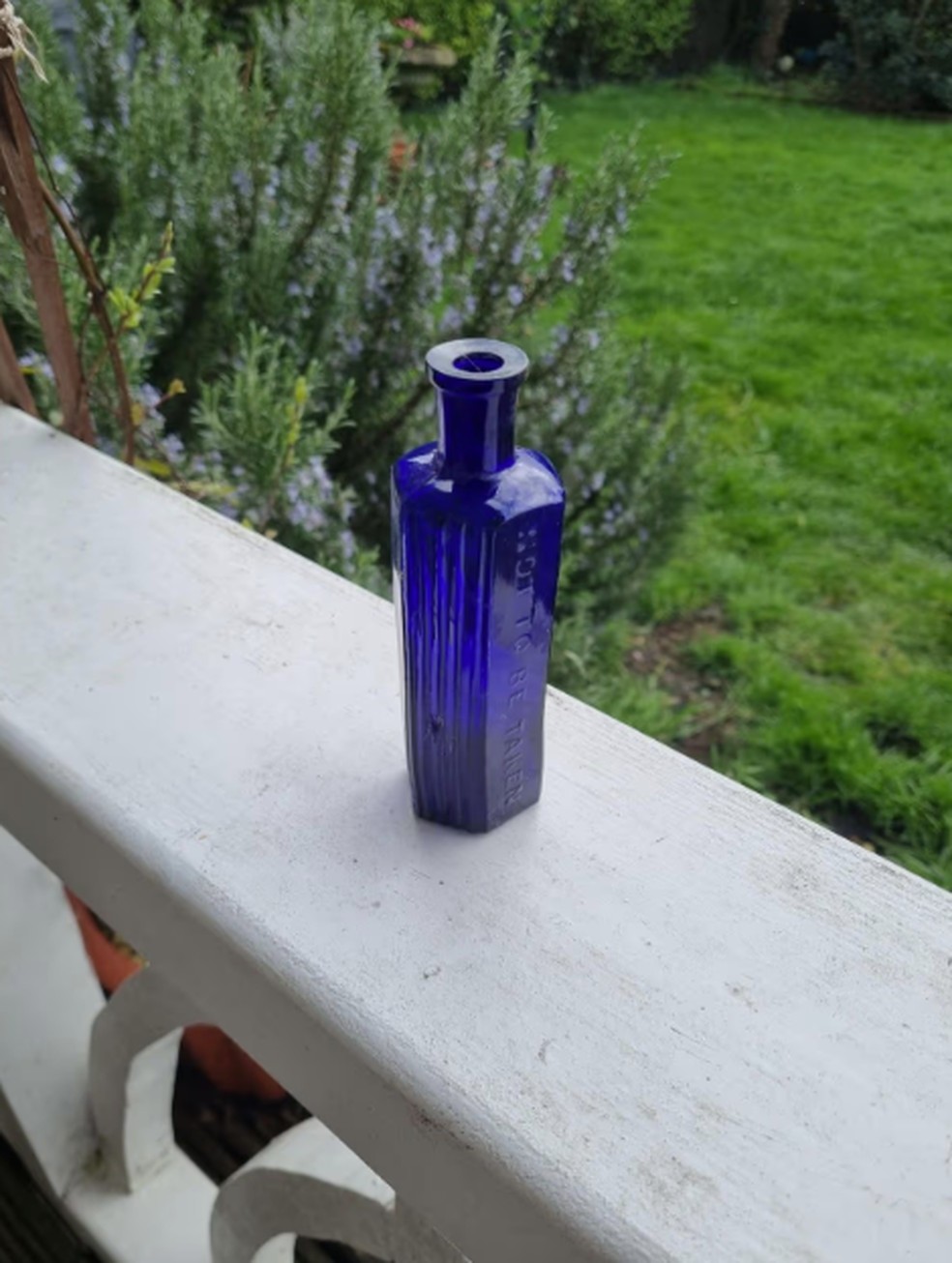 Na garrafa, é possivel ler os dizeres "Não é para ser tomada". A coloração e forma também se assemelha às garrafas de veneno azul-cobalto comuns na Inglaterra do século XIX.