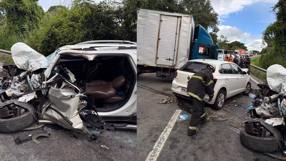 A colisão foi entre um caminhão, um carro de passeio e uma caminhonete. Segundo informações preliminares, há indícios de que o caminhão possa ter apresentado falha mecânica e invadido a contramão.