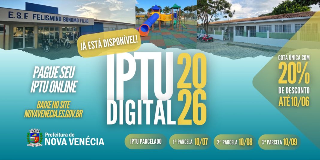 A Prefeitura de Nova Venécia informa que já está disponível para os contribuintes o IPTU Digital 2026. Quem optar pelo pagamento em cota única terá 20% de desconto, com prazo até 10 de junho.