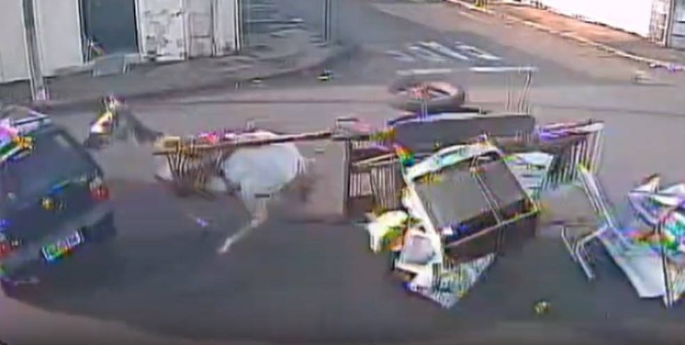 Uma cena inusitada foi registrada por uma câmera de monitoramento em Ituiutaba, no Triângulo Mineiro, na tarde de quarta-feira (18). No vídeo é possível ver o momento em que um cavalo desgovernado, puxando uma carroça com diversos objetos, provoca um acidente com um veículo no cruzamento das ruas José Silva Ramos e Joaquim Antônio da Silva, no bairro Alcides Junqueira.
