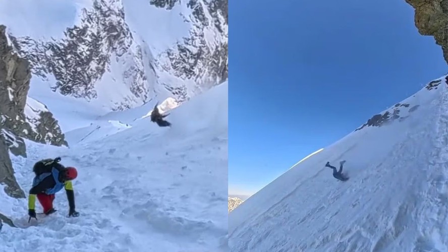 Ao escorregar, ele soltou a picareta cravada na neve e começou a deslizar rapidamente pela encosta íngreme da montanha, que alcança cerca de 2.500 metros de altitude. O vídeo mostra o momento em que o homem dá cambalhotas antes de conseguir parar alguns metros abaixo.