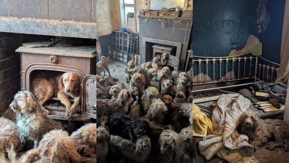 250 cães foram resgatados em situação precária na sala de estar de uma casa no Reino Unido no início de 2026. — Foto: Divulgação/RSPCA