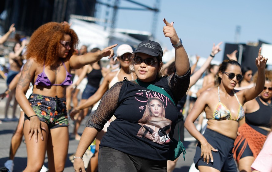 A primeira aula começou às 9h. Duas caixas de som foram montadas na Avenida Atlântica, sentido Leme. Entre o público, havia fãs da cantora colombiana, amantes de dança e curiosos — todos resistentes ao calor demais de 30°C deste domingo.
