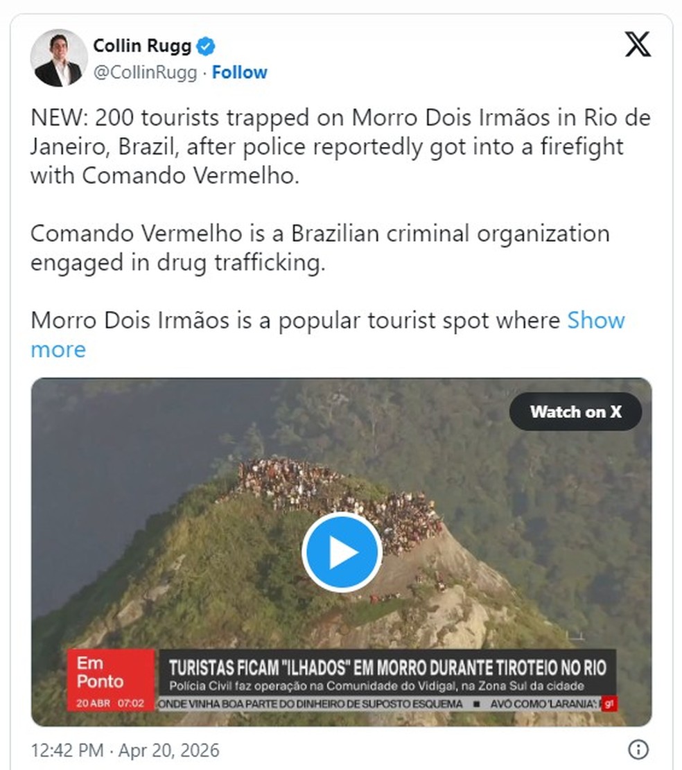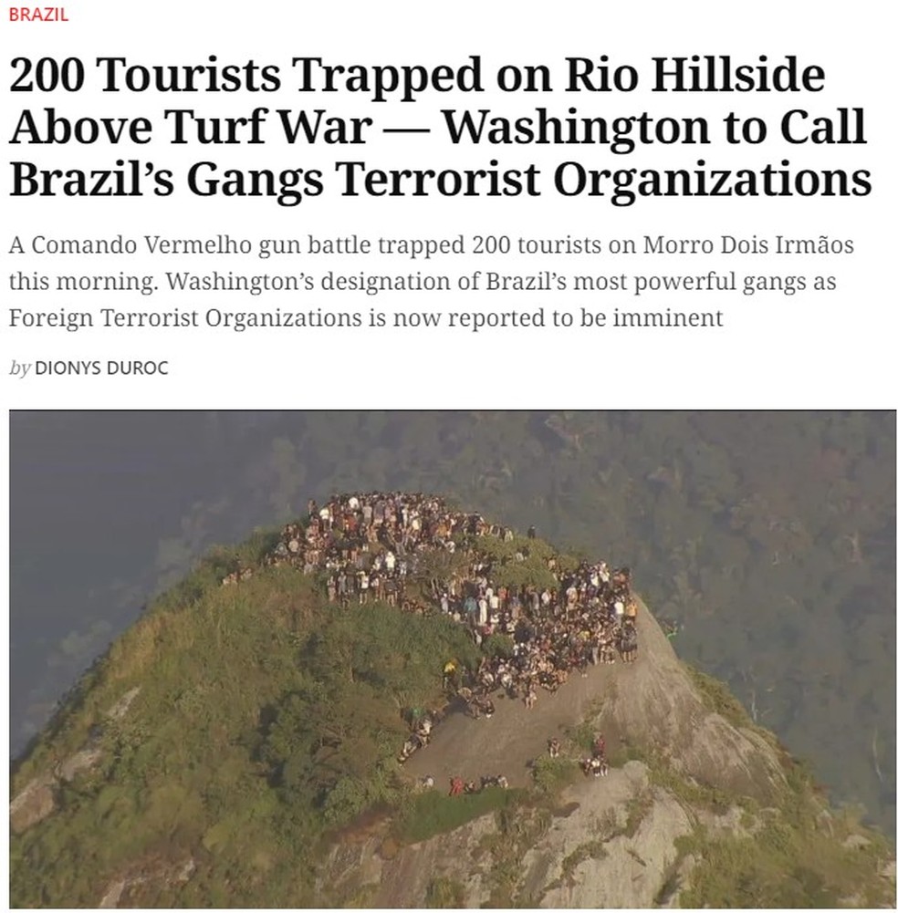 A operação policial contra integrantes do Comando Vermelho no Vidigal, na Zona Sul do Rio, na manhã desta segunda-feira (20), repercutiu na imprensa internacional, com destaque para o impacto sobre turistas que ficaram isolados no alto do Morro Dois Irmãos durante o tiroteio.