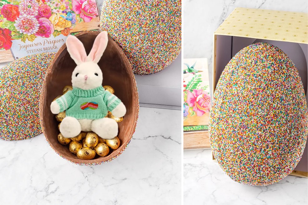 A grife de doces e chocolates de luxo Stefan Behar Sucré, conhecida pelas barras de chocolate "de ouro", vende nesta Páscoa o Ovo Gigante de Dragê Kids, de 2,9 kg, por R$ 1.698. O doce de chocolate ao leite vem recheado de ovinhos de Ovomaltine crocante.